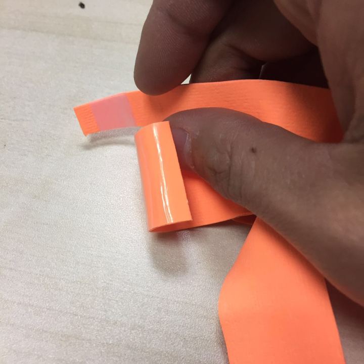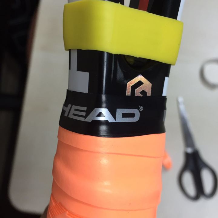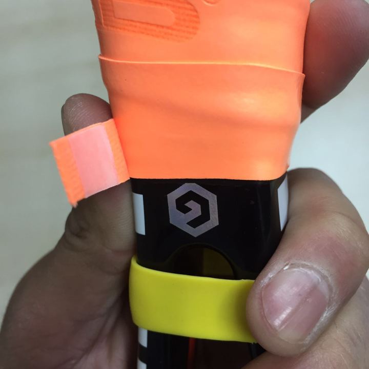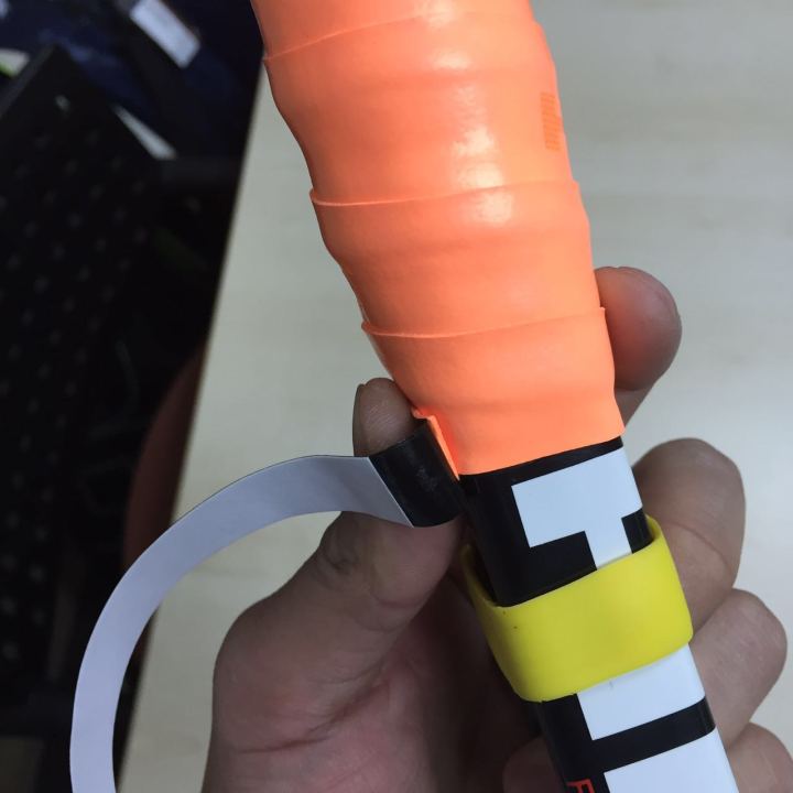 裁剪后使用大端作為起始,以小端結束。這里說明下裁剪的原因是為了在起始時更好的固定吸汗帶的位置,而不使用有雙面膠的小端作為起始是為了防止雙面膠破壞手柄底膠。
