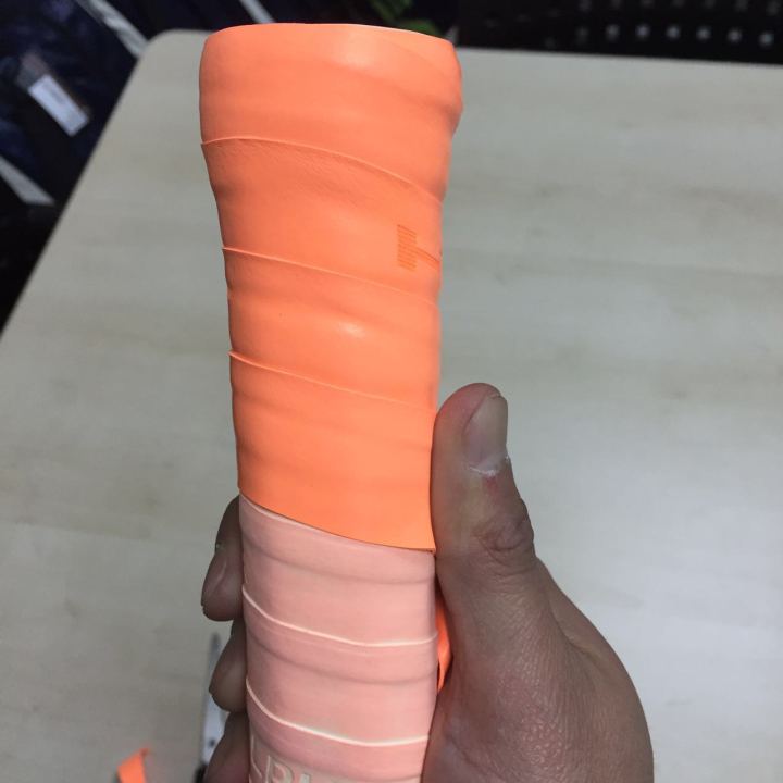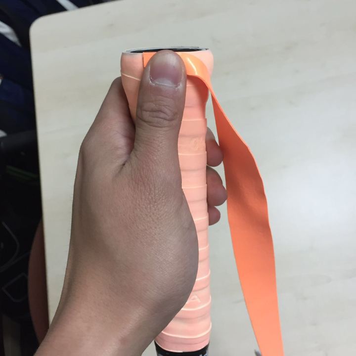 我這個是纏右手持拍的吸汗帶的方法,左手持拍紋路是相反的。纏的時候記得要稍微用力這樣會防止手膠由于太松而露出底膠。